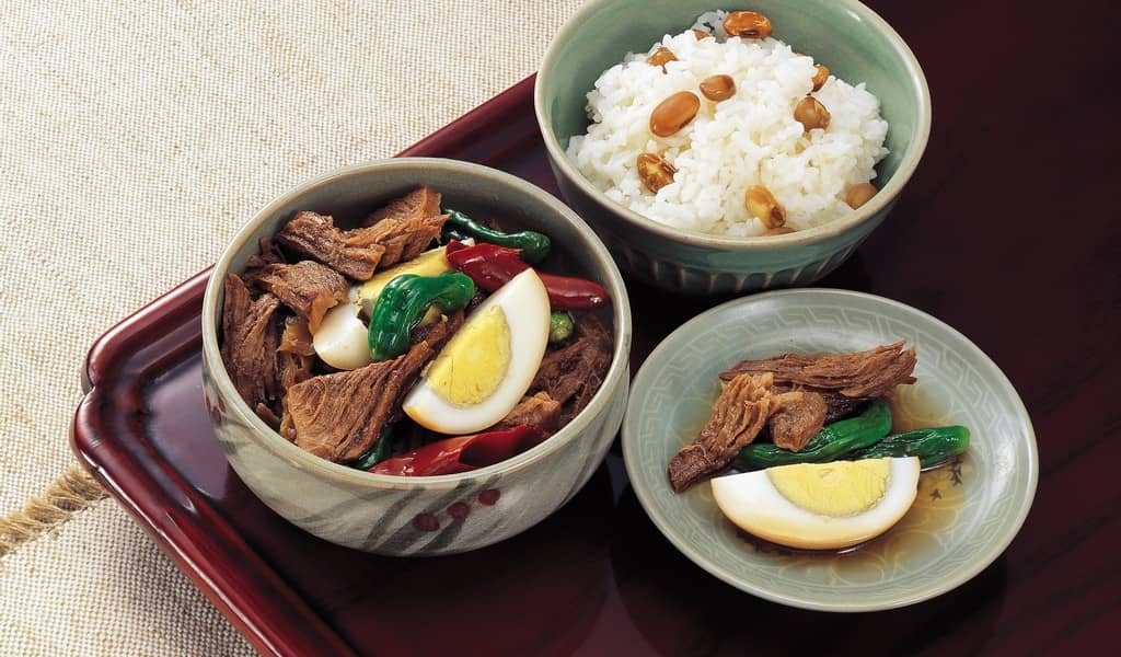 A dish often served as a side dish with meat cooked in soy sauce. A side dish that used to be the number one favorite side dish in lunch boxes of the past. They usually use beef. Eat with boiled eggs or quail eggs that can be eaten in one bite for convenience.