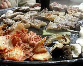 Samgyupsal is another popular Korean meat dish that are enjoyed at home or at Korean resaturants that specializes in meat dishes. It consists of thick pork strips, served in the same fashion as galbi but there is no marinating involved. It is usually cooked on a grill with pa muchim, kimchi, mushrooms, garlic, onions and consumed altogether. This dish is usually served with a side of lettuce, spinach, or other leafy vegetable(s), which is used to wrap a slice of cooked samgyupsal. A dab of ssamjang (usually made of gochujang or dwenjang), kimchi, or other side dishes are also added and then eaten as a whole. To see a visual illustration, click here.