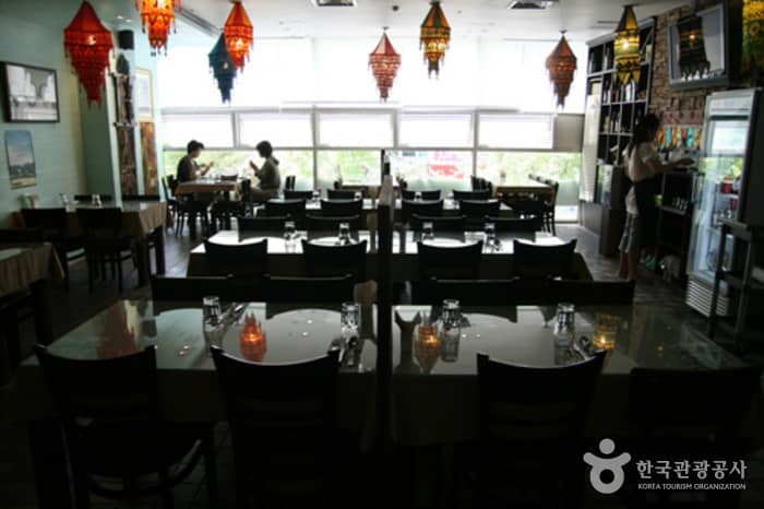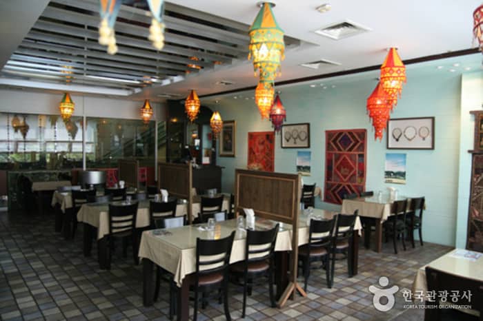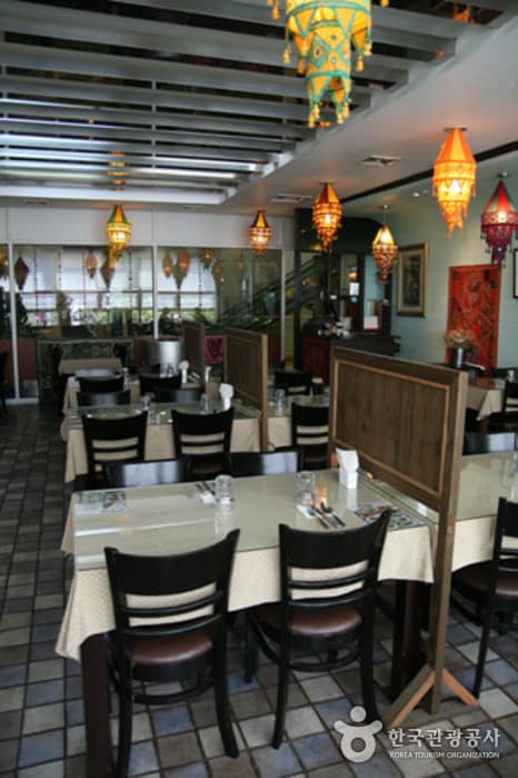 Royal India serves traditional Indian curry, various barbeque dishes cooked in tandoor, and naan bread in an exotic setting. The restaurant features Indian-style interior design, but most of the items on the menu are fusion Indian cuisine that is well-suited to Korean people’s taste buds.