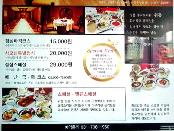 Chwihong is a Beijing-style Chinese restaurant located in Seohyeon-dong, Bundang. The restaurant’s signboard is decorated with red lamps and red letters, which definitely catches your eye from afar. Both the exterior and interior have a traditional Chinese vibe adding to the authenticity. The tasteful and upscale interior makes the place perfect for formal family meetings. The restaurant offers plenty of menu options including crab fried rice, lobster dishes and shark fin soup as well as course options like the ‘Wife’s Course’ and ‘Family Dinner Course’.