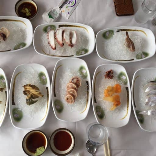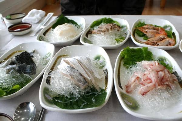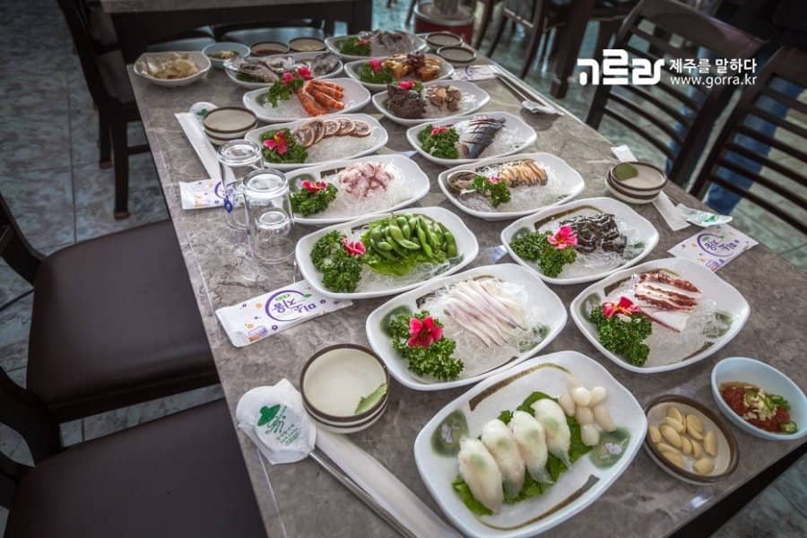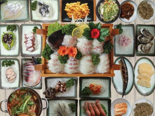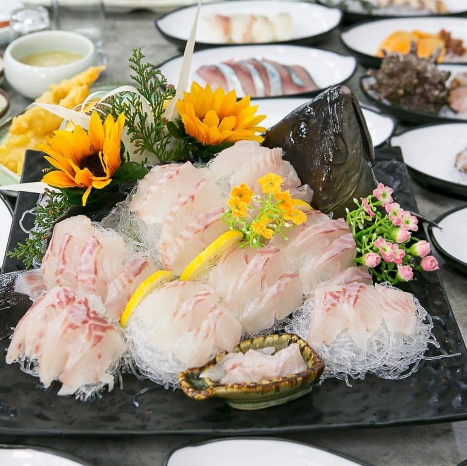 Haejin Sliced Raw Fish Restaurant strongly appeals to diners for two main reasons; it offers a prime selection of raw fish and a fantastic, wide-open view of the ocean as seen through the floor-to-ceiling windows on the 2nd and 3rd floors. Taking advantage its seaside location, the restaurant serves up a wide variety of fresh fish such as saw-edged perch, red sea bream, parrot fish, hairtail, and mackerel.