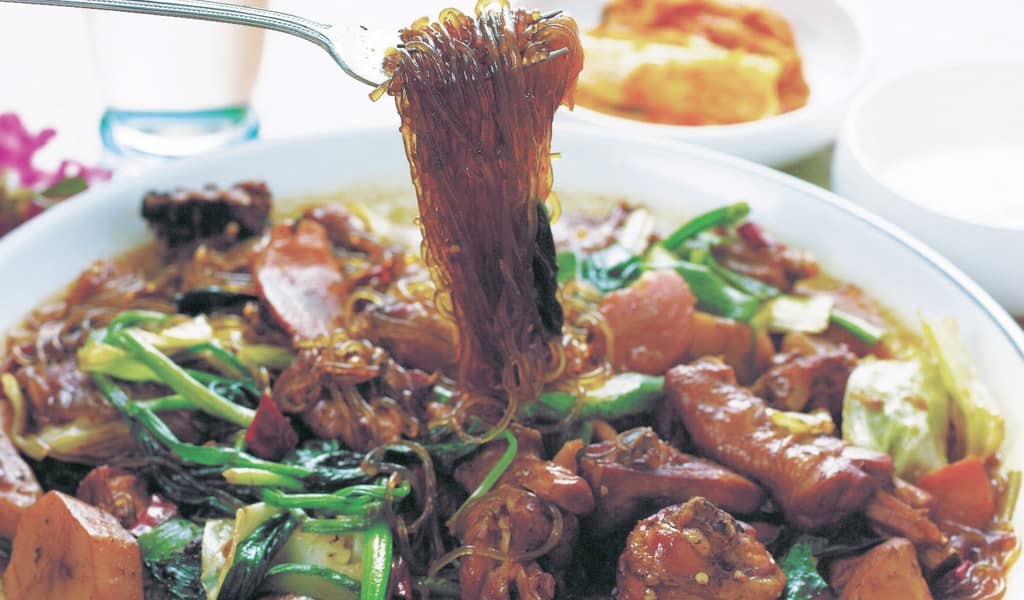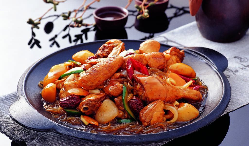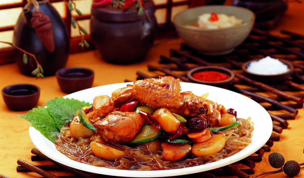 Jjimdak (찜닭) is a braised chicken dish. Jjim generally refers to dishes that are steamed, stewed or braised in a sauce, and dak means chicken.