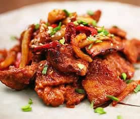 Jayook bokum also known as jaeyook kimchi bokum, is a delicious Korean dish that consists of marinated pork loin which are stir-fried with kimchi and red chili pepper paste, gochujang. When making jaeyook bokum, gochujang is the key base sauce to this dish which determines the flavor and its level of spiciness. Depending on one's taste, spiciness can be softened by adding more soy sauce and less gochujang and red chili powder to the sauce mix. Jayook bokum can also be prepared with thinly sliced pork belly strips, much like what's found in samgyupsal. Tofu is a great addition commonly found alongside this dish but it is sometimes eaten with a bowl of steamed, white rice to compliment its spiciness. Pork meat are initially cooked over a medium to high heat and then stirred fried with gochujang, kimchi, onions, carrots, scallions and other optional vegetables. Some prefer pork to be crispy and bacon-like prior to stir-frying all ingredients together. Jayook bokum is popular as an appetizer while drinking soju but also great and hearty as a meal with rice and many other side dishes. RECIPE INGREDIENTS: SAUCE 1-4 tbsp gochujang 1-4 tbsp soy sauce 1 tbsp garlic (minced) 1 tbsp sesame oil 1 tbsp ginger juice (or powder) 3 tbsp sugar Black ground pepper to taste 1 tbsp red pepper flakes (optional) 1 package of firm tofu (optional) RECIPE INGREDIENTS 20 oz. pork loin or belly ½-1 cup kimchi, bite sized 1 onion 2 stalks green onions ½ carrot 1 bell pepper (optional) 2 jalapeño peppers (optional)