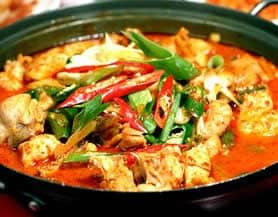 Dakdoritang is a traditional braised chicken dish that is full of spices and flavors which is known to be quite spicy in taste. Succulent chicken pieces such as thighs, breasts and/or drumsticks are simmered in a base soup where the meat tends to fall off the bones. It is marinated with hot pepper and soy sauce, containing assortments of vegetables such as green & red chili peppers, potatoes, onions and carrots. Some may include jalapeños to this dish in addition to gochujang (red chili pepper paste) in addition to gochugaru (red chili pepper flakes) which will surely wake up your taste buds. As it can get quite spicy, be sure to eat plenty of steamed rice to offset the heat RECIPE INGREDIENTS: YIELDS 4 SERVINGS 1-2 jalapenos (optional) 2 tbsp minced garlic 2 tbsp gochujang (red chili pepper paste) 2 tbsp gochugaru (red chili pepper flakes) 2 tbsp soy sauce 1 tsp sugar 2 tsp sesame oil 2 green onions 1 tbsp ginger 2 cups water Salt and pepper COOKING DIRECTIONS Peel potatoes and cut them into eight pieces (cut each potato in half and then cut each half into four quarters). Cut onions the same way as the potatoes. Peel carrot and cut it into lengths about the same size as its width. Cut each slice into four quarters. Slice jalapeño (julienne), if desired. In a heavy pot, combine all ingredients except green onions. Cover and cook for 30-40 minutes over a medium flame. Sprinkle salt and pepper to taste. Chop and add green onions to simmer for 5 additional minutes. Serve hot with rice.