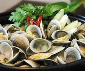 Joegaetang is a refreshing stew made with fresh clams and assortment of vegetables in a mild broth. It contains a generous portion of little neck clam (including shells) with soybean sprout, tofu, and hot peppers. Red chili pepper powder can be added for additional seasoning in spice. This is a popular dish found in Korean bars and restaurants which is enjoyed while drinking soju. It is usually served hot on a portable butane gas or jelly burners. RECIPE INGREDIENTS 12 little necked clams 1 stalk green onion 1 red pepper or jalapeño 1 clove garlic Salt Black pepper Water COOKING DIRECTIONS Thoroughly wash and clean clam shells and remove any visibile sediments. In a large bowl or pot, add water and 2-3 teaspoons of salt. Place clams and let it soak for at least 3 hours. Cut green onion into 1-inch long pieces. Cut red pepper or jalapeño into match stick sizes approximately 1-inch long. Mince garlic. Set all vegetables aside. Discard salt water and rinse clams once more. Put clams into a pot and add 6 cups of water. Bring pot to boil on high heat. When clam shells start to open, lower heat to medium. Add green onion, red pepper, and minced garlic. Season with salt and balck pepper, bring it to a boil once more. Serve hot.