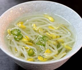 Kongnamulguk is a refreshing Korean soup primarily based on soybean sprouts, some minced garlic and scallions which is cheap and easy to make. It is considered to be light and healthy, containing full of vitamin C and low in calorie content. Very much similar to bookuhguk, this soup can be a great ailment for hangovers as well as colds. For spicy food lovers, splash of red pepper flakes (gochugaru) can be added to add some kick to the flavor. RECIPE INGREDIENTS 2 cups soybean sprouts 2 cloves garlic, minced 1 stalk scallion 2 tbsp soy sauce 1 tbsp sesame oil 1 tsp salt 5 cups water 1-2 tbsp gochugaru (optional) COOKING DIRECTIONS Thoroughly wash soybean sprouts and drain water thereafter. Remove any bad parts and trim roots, if desired. In a pot, sauté garlic in soy sauce and sesame oil over medium heat for 2-3 minutes. Add water, salt, soyean sprouts and bring to a boil over high heat. Reduce to low heat and simmer for 15-20 minutes. Make sure to cover pot and try not to remove lid as the flavor will spoil. For spicy version, add gochugaru 5 minutes before turning off the heat. Chop and garnish with scallion before serving.