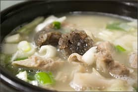 Soondaeguk is a soup variation of sliced soondae sausages and noodles in a mild pork or even ox bone broth. Other ingredients can contain but not limited to pig tripe, liver, vermicelli noodles, onions, sesame leaves, and many other vegetables. It’s usually served in a milky broth in a black ceramics bowl (ddukbaegi) with a separate bowl of steam white rice (bop) which can be added into the broth for an even heartier meal. Some restaurants also serve condiments such as hot peppers, coarse chili sea salt and fermented micro-shrimp dipping sauce (saewoojut) that compliments the soondae’s sweetness in taste. Other side dishes or banchans that are present alongside this is kimchi or kkakdugi and some restaurants may serve this dish spicy by adding gochujang and gochugaru.