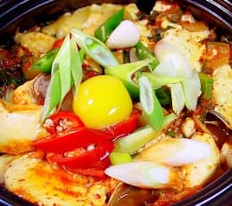 Soondooboo chigae is a spicy stew made with soft uncoagulated tofu that is produced by compressing and curdling tofu to remove excess water. There are numerous variations of this dish consisting of seafood, beef, pork and/or vegetable contents. Plain soondooboo chigae is usually made with some added pieces of pork, several small clams, chopped garlic, and red chili pepper flakes (gochugaru) along with chopped leeks and sesame oil. In addition, there are different levels of spiciness for this dish; light, medium and hot. The ingredients and spicy broth are added to a generous amount of soondooboo in a ttukbaegi (ceramic bowl) and boiled over an intense heat. If preferred, a raw egg may be included to add flavor as well as thickness which can dilute its spiciness of the broth. Main ingredients may vary depending on their availability and the preferences of the restaurants as it is served during lunch or dinner, especially during the winter seasons. RECIPE INGREDIENTS 1 pack soondooboo (soft tofu) 8 small clams, cleaned 4 oz pork (or beef), sliced ¼ cup kimchi, roughly chopped 1 red hot chili, sliced 2 green hot chilies, sliced 2 green onions, sliced 1 egg yolk (or whole) 1 tbsp gochugaru (red chili pepper flakes) 1 tbsp vegetable oil 1 tsp minced garlic ½ tsp juice of ginger 1 tsp soy sauce ½ tsp sesame oil 1 tsp saewoojeot (salted shrimp) 3 cups water COOKING DIRECTIONS Marinade pork with ginger juice, soy sauce, sesame oil and minced garlic. In a pot, add vegetable oil and sauté pork. Add gochugaru and keep stir. Add water and kimchi, bring to a boil. Scoop in soondooboo with a spoon. Reduce heat, add saewoojeot. Add chilies, green onions and clams. Cook for 1 minute or so. Finish with egg yolk (or whole) in the center and a dash of sesame oil. Serve with rice.