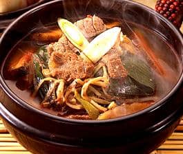 Yookgaejang is a spicy beef soup consisting of variety of ingredients. It is made of shredded beef boiled with bean sprouts, fern brake, red pepper, green onions, garlic, soy sauce, oil and pepper. It is served as a hot soup and usually eaten with a bowl of white rice. The key ingredient of yookgaejang is red chili pepper flakes (gochugaru) which turns the soup into a nice red color. This is one of Korea's hottest dishes and is not for those who dislike spicy foods. The soup is considered to be very healthy and refreshing in taste. Chicken can be used as a substitute for beef RECIPE INGREDIENTS 1 lb beef (any part for quick cooking), 2 inches julienne ½ lb bean sprouts ½ cup packaged fern brake in water (gosari), drained 2 green onions, 1 inch bias cut 3 tbsp gochugaru (red chili pepper flakes) 1 tbsp soy sauce, 2 tbsp garlic, minced 1 tbsp sesame oil, salt, pepper 8 cups water COOKING DIRECTIONS In a big pot, sauté beef with soy sauce, sesame oil, and red chili pepper flakes for 4-5 minutes. Add water and bean sprouts, cover lid and bring to a boil. Reduce heat to medium low, cook for 20 minutes, add fern brake, cook for another 20-30 minutes until beef gets tender. Add green onions, salt and pepper to taste when served.