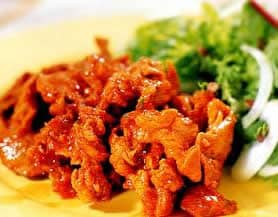 Daeji bulgogi is another popular Korean meat dish similar to bulgogi. However, instead of using beef, thin sliced pork loin is marinated in a specially blended red chili pepper paste with various assortments of vegetables. The meat is marinated with a mixture of soy sauce, sesame oil, garlic, sugar, ginger roots, rice wine and gochujang which is the base sauce for this dish. It is marinated for 30-60 minutes to bring out the depth and intensity of flavors. Daeji bulgogi can be grilled or pan-cooked and it is usually served with a side of lettuce, spinach, or other leafy vegetable, which is used to wrap a slice of cooked meat. It is often times wrapped along with a dab of ssamjang, kimchi, or other side dishes, and then eaten as a whole. To see a visual illustration, click here. Korean 101: Daeji means pork in Korean and bulgogi is the word for fire meat, therefore, it translates into pork fire meat. Since gochujang is the base sauce to this dish, it can get spicy in taste. RECIPE INGREDIENTS 1 lb thinly sliced pork (lean & boneless preferred) 3 tbsp soy sauce 2 tbsp crushed garlic ½ tbsp crushed ginger root 2 tbsp brown sugar 2 tbsp gochujang (red chili pepper paste) 1 tsp red pepper flakes 2 tbsp rice wine (sake) 2 tbsp sesame oil 1 onion COOKING DIRECTIONS Combine all the ingredients except pork to make its base marinating sauce. Stir in a large mixing bowl. Add the pork and marinate for 30-60 minutes. Grill or pan-fry and serve with steamed rice.