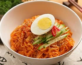 Bibim guksu, a cold dish made with very thin wheat flour noodles called somyun with added flavorings, is one of the most popular traditional noodle dishes in Korean cuisine. It is also called guksu bibim which literally mean stirred noodles or mixed noodles. The dish is especially popular during the summer season much like another similar Korean noodle dish called jjolmyun. There are many kinds of cold noodle dishes in Korea, including one made with cold beef broth; however, spicy cold noodles have historically been appreciated by spicy food lovers in Korea and also recognized internationally. What makes this dish so distinct from other cold noodle dishes from different cultures is the strong spicy flavor produced from the combination of gochugaru (red chili pepper flakes), gochujang (red chili pepper paste), and minced garlic, along with a sweet-and-sour flavor created by vinegar and sugar. Most spicy cold noodles are prepared with a slight touch of sesame oil to enhance the richness of its flavor. Typically the dish would be prepared by stir frying diced beef, julienned pickled cucumbers, and mushrooms in sesame oil, which is all mixed together with the cooked noodles, soy sauce, sesame oil, sesame seeds and sugar. Garnishes placed on top and around the spicy noodles include hard-boiled eggs, pickled radish, dried layer strips, cabbage, sesame leaves, and sometimes sliced Korean pear.