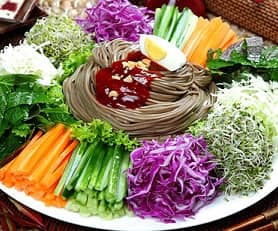 Jangban guksu is a healthy and delicious noodle dish mixed with assortment of vegetables. Buckwheat noodles are mixed in with perilla/sesame leaves, cucumbers, lettuce, cabbage, and carrots in a zesty spicy sauce called chojang. Chojang comprises of watered down gochujang mixed with chopped green onions, rice vinegar, sesame seed and sesame oil. Different variation of this noodle dish exist, including a non-spicy version in which gochujang is substituted with soy sauce along with other ingredients as its base sauce. Additionally, thin strips of Asian pear can be added for additional mixture in taste as well as a boiled egg for garnish RECIPE INGREDIENTS Buckwheat noodles (2-3 bundle wraps) 1-2 eggs 2 tbsp gochujang 1 tbsp rice vinegar 1 tsp sesame oil 1 tsp sesame seed 1 stalk green onion (chopped) 2 red leaf lettuce leaves (chopped) 1 carrot (julienne) ½ Asian pear (julienne) 5 perilla/sesame leaves 1 cucumber 1 tsp sugar Can 7UP or Sprite soda (optional) COOKING DIRECTIONS To make sauce, you can either add water and sugar; or substitute it with the soda (2-3 tbsp). If using soda, do not add sugar. In a bowl, add gochujang, rice vinegar, sesame oil, and water/sugar or soda. Mix all ingredients together until it becomes diluted. Finely chop green onions and add to mix. Refrigerate for later use. For non-spicy sauce, mix: 2 tbsp soy sauce ½ tbsp sugar 1 tbsp water 1 tsp mirin 1 tsp sesame oil Black pepper Chopped green onions Boil enough water and add buckwheat noodles until it becomes soft. Drain and put aside to cool. Recycle or boil more water to make hardboiled egg(s). Boil for 5-6 minutes and peel off the shells. Put aside for later use. Cut Asian pear, carrot, red onion, and perilla/sesame leaves into thin julienne strips. In a large bowl, mix all ingredients together, including sauce. Cut boiled eggs in half and garnish on top of the dish.