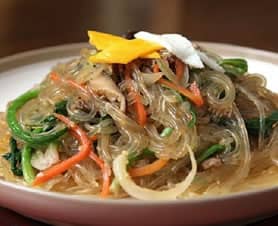 Japchae is a stir-fried dish that combines sweet vermicelli noodles made from the starch of a white sweet potato, thinly slices of beef, and various vegetables. It is usually prepared with carrots, green onion, spinach, shiitake mushrooms and green peppers. Beef may be added as an option but may be left out to be served as a vegetarian dish. The noodles are gray when raw and turn almost translucent when cooked (thus given its popular nickname, glass noodles). When cooked correctly, they retain a chewy texture. Japchae is often served at Korean parties and during special occasions as the main dish or as a side dish. It can be added to a bed of rice and mixed together to make japchaebop, bop meaning rice RECIPE INGREDIENTS 12 oz noodle (Dang Myun) 4 oz beef 5 shitake mushrooms or Chinese black mushrooms 1 carrot 1 onion 1 egg ⅓ lbs spinach 5 tbs oil 1 tbs sesame seed oil 2 tbs soy sauce Salt & black pepper (pinch) Sesame seed (pinch) 1 tbs minced garlic 1 tbs chopped green onion COOKING DIRECTIONS Soak mushrooms in water for 15 minutes. Cut off stems then cut the caps into thin strips. Cut beef into thin strips and marinate it with the mushrooms in a seasoning of: soy sauce, sugar, minced garlic, sesame seed oil, chopped green onions, and a pinch of ground pepper. Cut carrots and onion into thin strips (julienne). Cook spinach in boiling water for about two minutes. Cool spinach in running water. Squeeze the water out of the spinach. Season the spinach slightly with salt and sesame seed oil. Batter and fry the egg in a pan with a pinch of salt. Once cooked and cooled, cut the egg into thin slices. Cook the noodles in boiling water for about 2-4 minutes or until soft (You may want to cut the noodles in half before hand if they are too long). Rinse in cold water and drain. Start cooking the beef and mushrooms with a bit of oil. When beef is cooked, add carrot, onion, spinach, and noodles and stir-fry. When vegetables are cooked, add the sliced egg and use salt and soy sauce to season the dish to your taste. Put it all in a dish and sprinkle some sesame seeds for the final touch. Can be served hot or cold.
