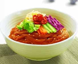 Jjolmyun refers to either a type of Korean noodles that have a very chewy texture and are made from wheat flour and starch or a cold and spicy dish made with the noodles, half boiled egg, and vegetables. Vegetables may include but not limited to cucumber, carrots, bean sprouts and shredded cabbage. The spicy and hot sauce is a combination of gochujang (chili pepper paste), vinegar, sugar, and minced garlic. It is also a type of bibim guksu, also known as mixed noodles in Korean and it's especially popular during the summer season. This dish is one of the most popular noodle dishes in South Korea, especially among young people at bunsikjeom or Korean snack restaurant. It is a representative dish of Incheon, where it originated in the early 1970s by mistake while attempting to make naengmyun