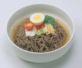 Mak guksu is a Korean buckwheat noodle dish served in a chilled chicken broth, sometimes served with sugar, mustard, sesame oil or vinegar. It is closely related to naeng myun but the differences lie in the high concentration of buckwheat flour in its noodles and the use of greater amounts of vegetables. The dish gets its name "rough noodles" from the fact that the buckwheat used is generally unhulled. Mak guksu is usually prepared directly from buckwheat crop, soaked, and ground into a paste. Since buckwheat is less glutinous than most grains, buckwheat flour is particularly difficult to knead, roll, and slice into noodles by hand; thus, the noodles are often created in a hand-cranked noodle-making machine instead. It's difficult to generalize for mak guksu's accompanying ingredients. Ingredients are traditionally determined by the customer rather than the restaurant owner, and many restaurants also carry their own unique flavoring recipes. In most cases, mak guksu is very spicy, sometimes seasoned with gochujang (hot pepper paste) and various types of kimchi can be added as well. Many recipes may also add various vegetables and/or soy sauce but frequently accompanied by boiled slices of beef or pork meat.