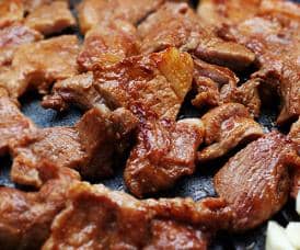 Galbi is a very popular Korean meat dish made from beef short ribs. The ribs are marinated in a sauce made from Korean pear juice, rice wine, soy sauce, garlic, sesame seed oil and sugar. Most recipes contain these basic ingredients but many variations exists from sweet to spicier marinades. The meat itself is often cut in the L.A. rib style, which is basically a rack of ribs cut in thin slices across the bones. This makes eating galbi easier with chopsticks or with fingers. Galbi is usually available in most Korean restaurants but it is generally served in venues that specialize in galbi and the meat is cooked on an in-table BBQ. This dish is usually served with a side of lettuce, spinach, or other leafy vegetable, which is used to wrap a slice of cooked meat, often times along with a dab of ssamjang, kimchi, or other side dishes, and then eaten as a whole. To see a visual illustration, click here. Galbi itself means rib in Korean and there are many dishes that incorporate galbi to make soups and stews such as galbitang and galbijim. RECIPE INGREDIENTS 16 ribs 1 cup soy sauce ¾ cup sugar ½ cup water 1 Asian pear, chopped (or ½ Korean pear) 1 onion, chopped 2 tbsp minced garlic 4 tbsp sesame oil 1 tbsp ground pepper 1 tbsp juice of ginger COOKING DIRECTIONS Wash meat. Rarely but sometimes you can find tiny bone scraps stick to the meat. Soak in water for 1 hour, drain. In a food processor, add chopped onion and pear, purée finely. Pour out to a large bowl, add remaining ingredients and stir. Marinate beef for 8-10 hours or overnight for optimal taste. They cook fairly fast, 2-3 minutes on one side. Traditionally, it is grilled with a wood charcoal but certainly you can grill on a gas stove or outdoor grill.