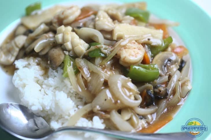 It is then served alongside a bed of steamed white rice (bop) and mixed altogether before eating. It's a popular rice dish usually served at Chinese/Korean restaurants only and it commonly includes scallop, sea cucumber, squid, mussel, shrimp, and various vegetables such as bok choy, shiitake mushrooms, red or green peppers, baby corn and water chestnuts.