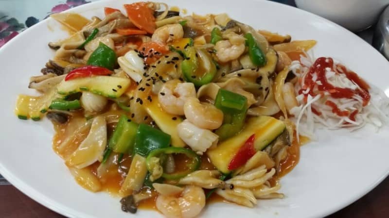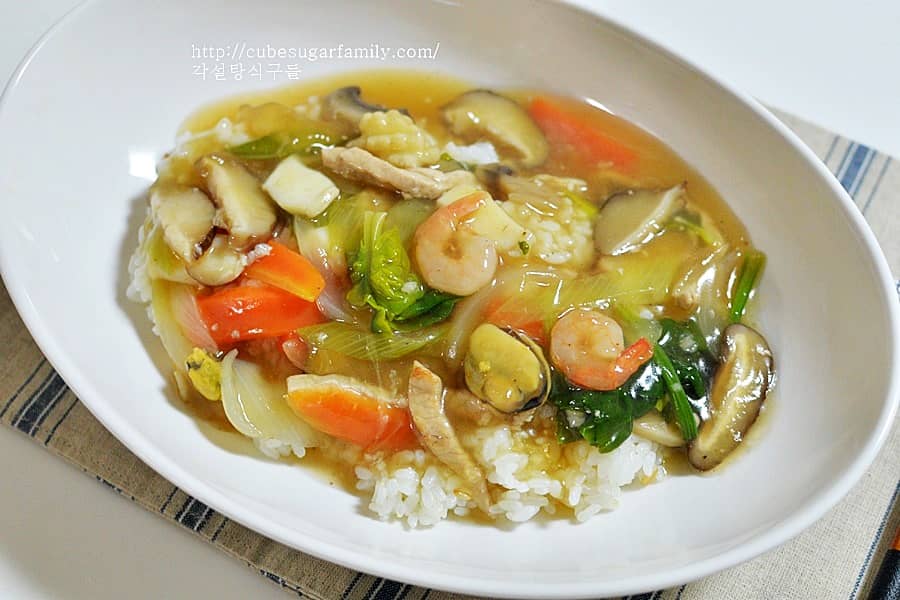 Japtangbap is a delicious rice dish made with an assortment of seafood that are stir-fried in a clear, thick sauce usually made with corn starch.