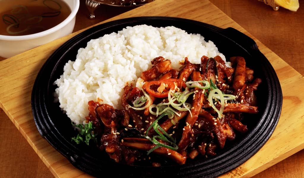 In Korean, dupbop literally means "over rice" so fresh squids are cut into bite-sized pieces then pan stir-fried with spicy gochujang along with gochugaru and served with steamed white rice. Assortments of vegetables that can be included in the spicy sauce mix are green & red chili peppers, mushrooms, green onions, carrots and onions.