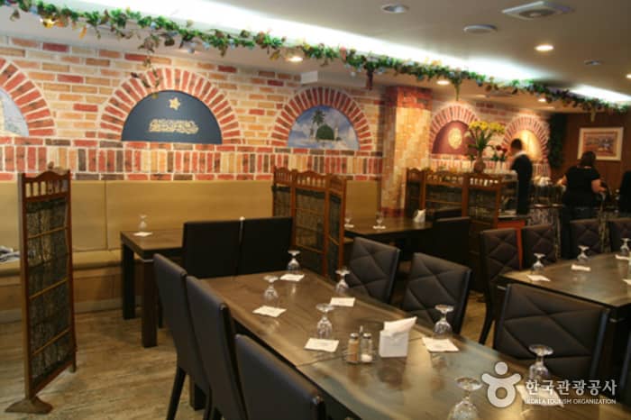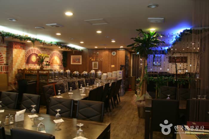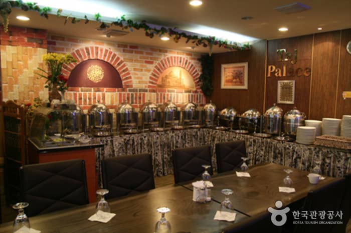 Named after the Taj Mahal, Taj Palace serves authentic Indian dishes prepared by an Indian chef. The restaurant owner hired the Indian chef in hopes of introducing real Indian food to Korean people. Some of the most popular dishes in the restaurant include tandoori (barbecue) dishes, Indian fried rice called "briyani," toasted bread, Indian beverages, and the “set meal."