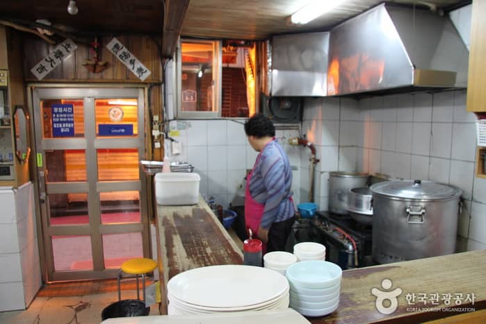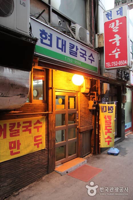 Hyundai Kalguksu is a kalguksu (handmade knife-cut noodles) restaurant that has been in the family for two generations (1982). The restaurant is extremely popular among people working at nearby businesses, thanks to the rich flavor of the broth. Anchovies, dried pollack heads, and kelp are simmered for many hours, and then, other ingredients are added: soft noodles and various vegetables including pumpkin, onion, and green onions. The restaurant is famous for the exquisite taste of its kalguksu, as well as for its large servings. Just one bowl is enough to satisfy a starving man, but if you are still hungry, don’t hesitate to ask for more rice or noodles for free. Another unforgettable specialty here is kimchi. You will also be able to enjoy geotjeori (freshly made kimchi) and kkakdugi (sliced white-radish kimchi), which is fermented for about three days. TIP: If you like spicy food, don’t forget to add some cheongyanggochu (spicy red pepper)!Administration Hyundai Kalguksu