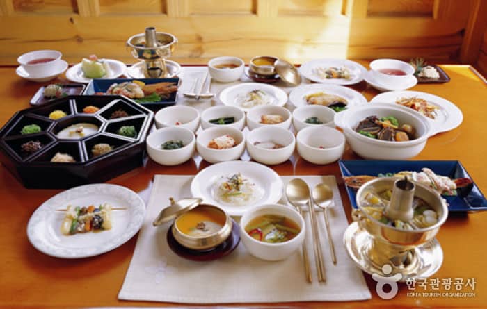 Bongraeheon serves savory royal Korean dishes in a great natural environment. It was designated a Proud Korean Restaurant in 2007 by the Seoul Metropolitan Government. It is located in a traditional Korean building built by Lee Il-gu, a master carpenter and Human Cultural Property who participated in the restoration of Gyeongbokgung Palace. With high ceilings, the whole building has a soothing smell of pine. It’s a popular place for business dining as well as the first meeting between the parents of soon-to-be bride and groom. The restaurant specializes in course meals including gujeolpan, geonoljeolpan, sinseonno, jeonbokcho, hanbang kkorijjim, and stone baked mushrooms.