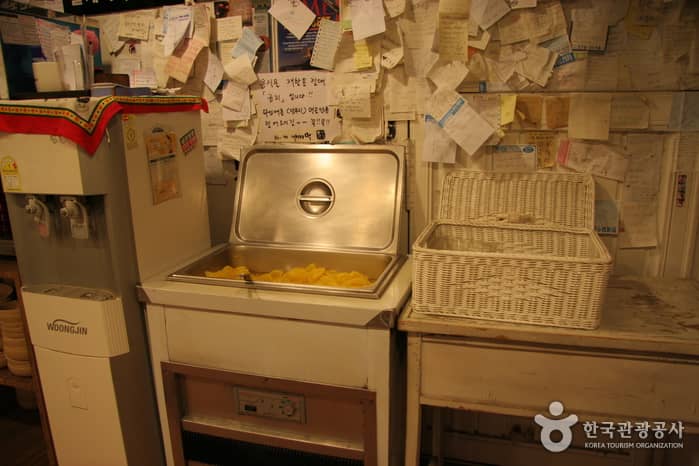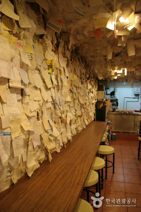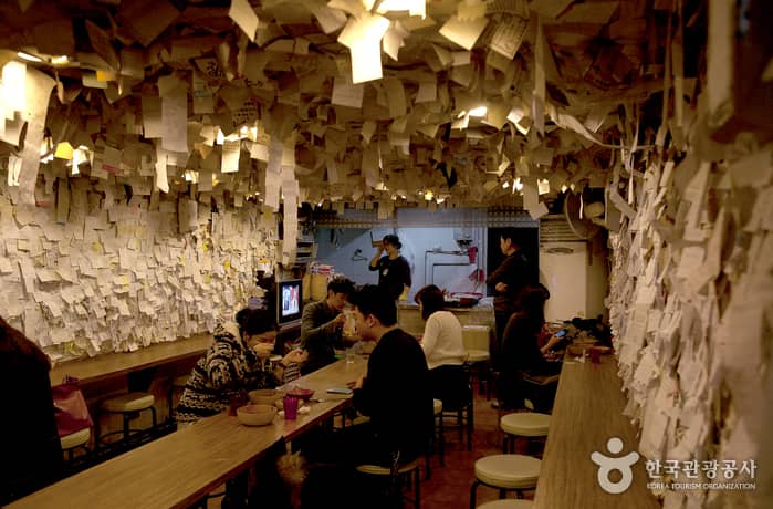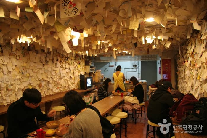 Opened in 1981, this diminutive restaurant has been attracting customers with its mouthwatering ramyeon noodles for more than 20 years. The restaurant’s unique ramyeon recipe includes an ultra-spicy broth with lots of red pepper seasoning, chewy noodles, egg, and bean sprouts. Even Koreans, who are used to eating spicy kimchi, sometimes shed tears while eating this fare. Besides the food, the ambience is fun, with interesting messages written by customers attached to the ceiling and the walls. The restaurant has created its own jargon that is recognized only by regular customers: ramyeon is called ppal-gye-tteok (spicy red soup with egg and rice cake), and yellow pickled radish is called pineapple, to name a few of the coined terms. The menu board lists the price of ramyeon as W30,000 confusing first-time visitors. But don’t panic: an extra zero (0) was just added for fun!