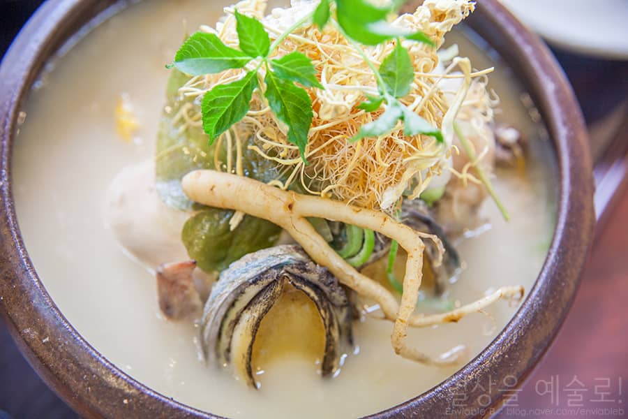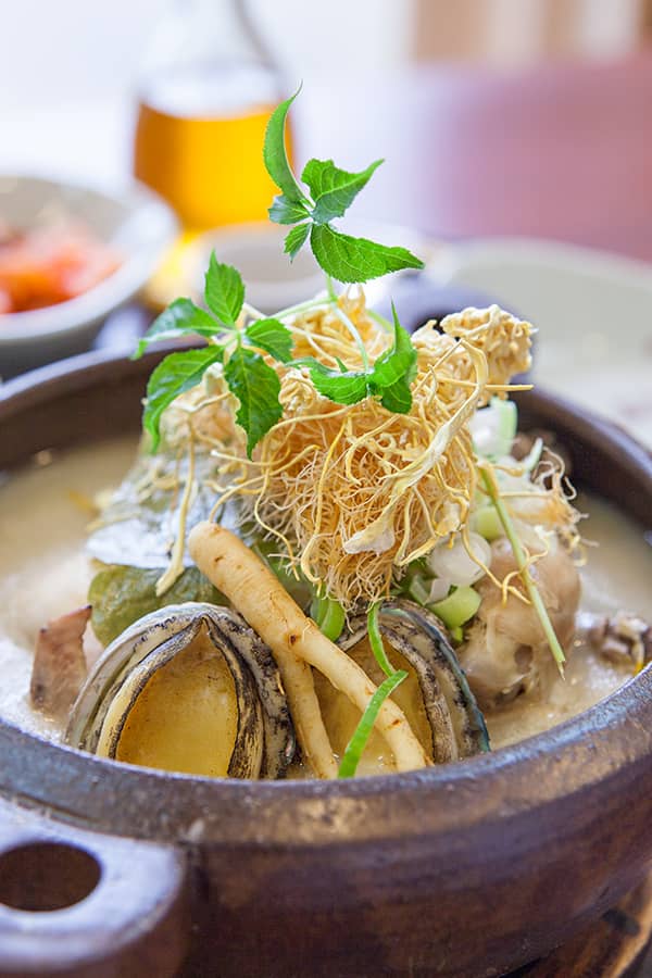 Hwanghu Myeongga’s wonderfully healthy samgyetang (chicken ginseng soup) is made by boiling ground grain and over 19 medicinal herbs in one big pot for about 28 hours, giving the soup its unusually deep and rich color. Not just a delicious meal, this samgyetang is packed with natural health benefits thanks to its special mix of medicinal herbs.