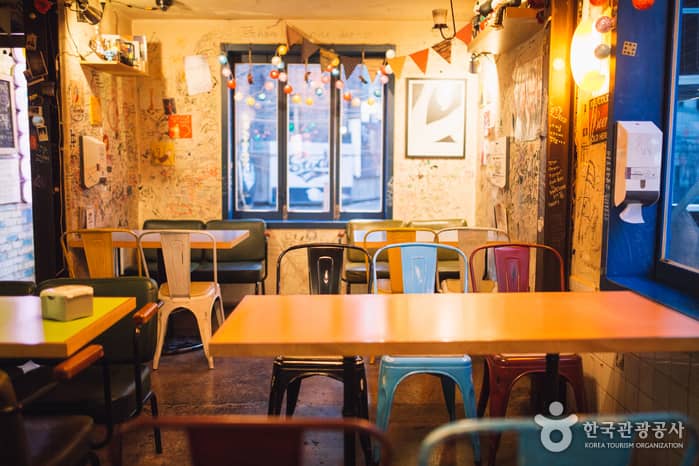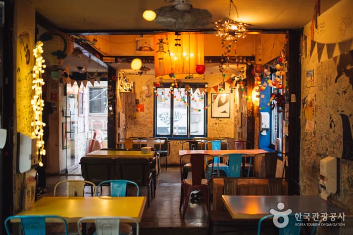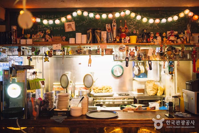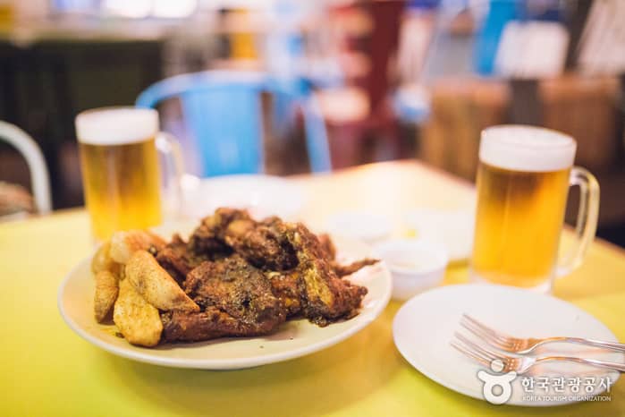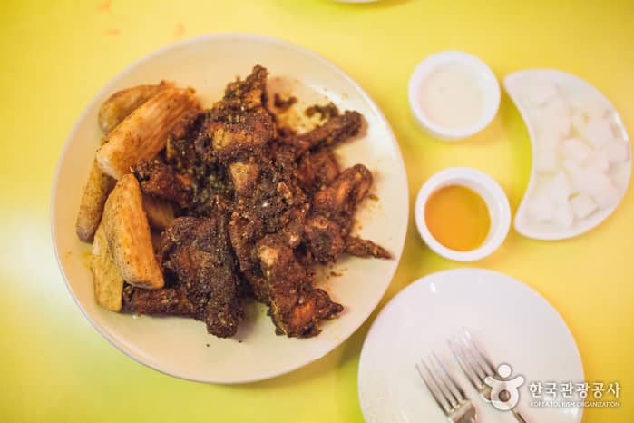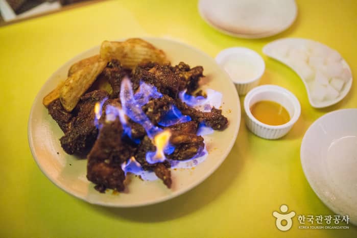 Oksang Dalbit is a popular chicken restaurant in Hongdae with garlic pepper chicken as its specialty. The fried chicken seasoned with garlic and pepper is sprinkled with vodka then set on fire for about 15 seconds. This fire show not only offers fun but also adds a kick of smoky flavor.
