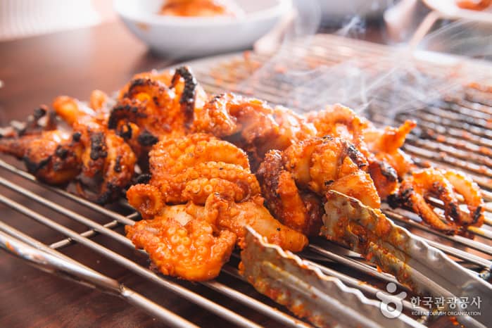 Introduction Chungmuro Jjukkumi Bulgogi has been loved by customers for 40 years with only Sutbulgui jjukkumi bulgogi (charcoal-grilled ocellated octopus with bulgogi). In particular, their special sauce for jjukkumi seasoning features properly spicy and sweet taste adding more flavor to the dish.